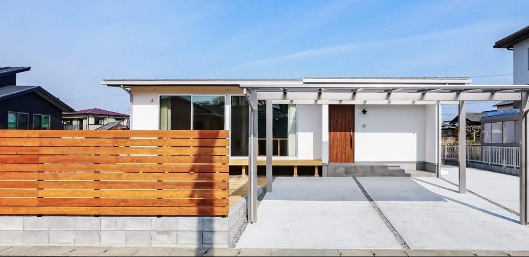 白壁とウッドデッキ・ガレージが印象的な平屋