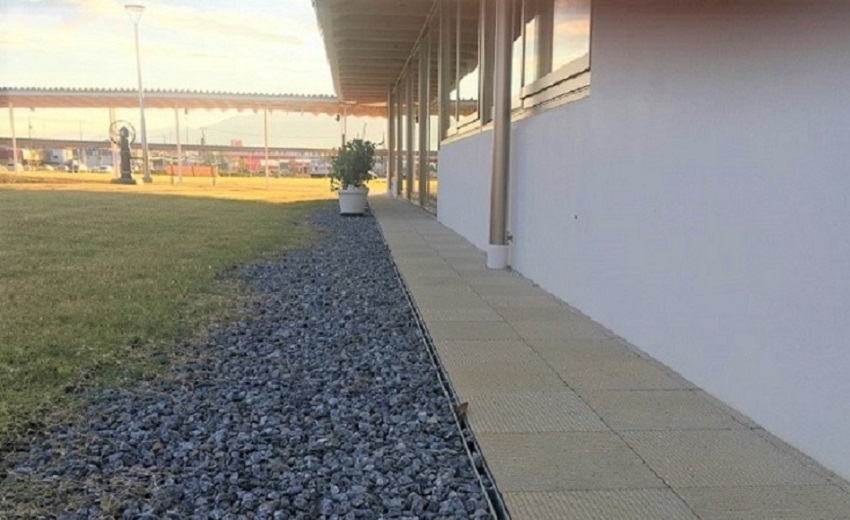 深い軒の下には雨排水と見られるグレーチング